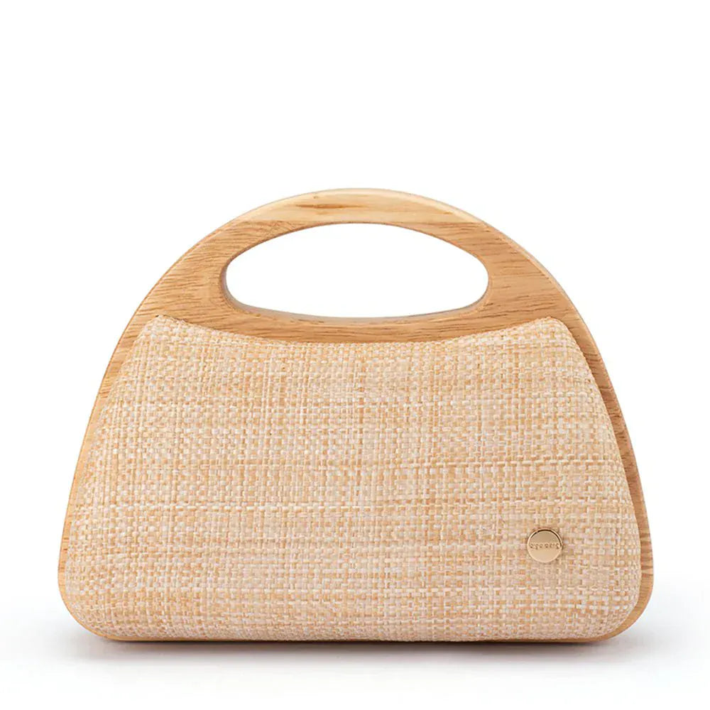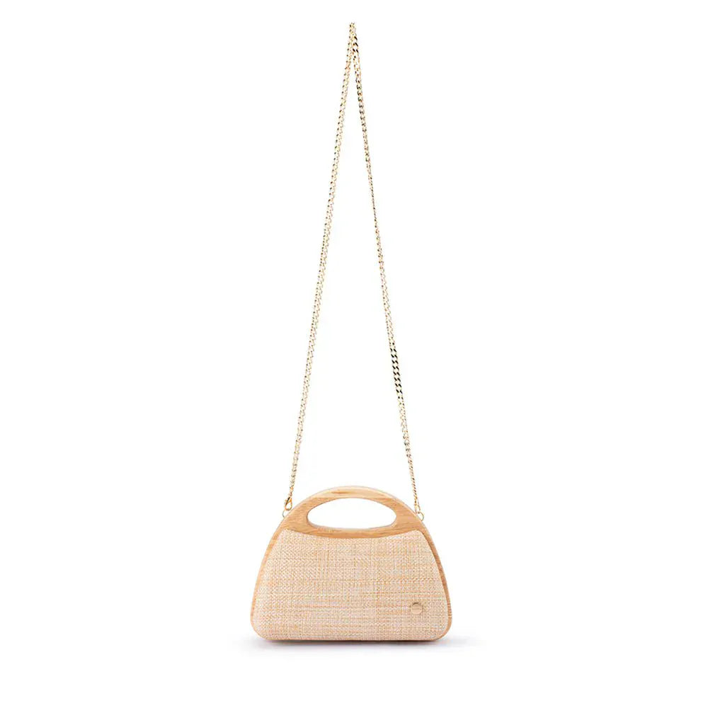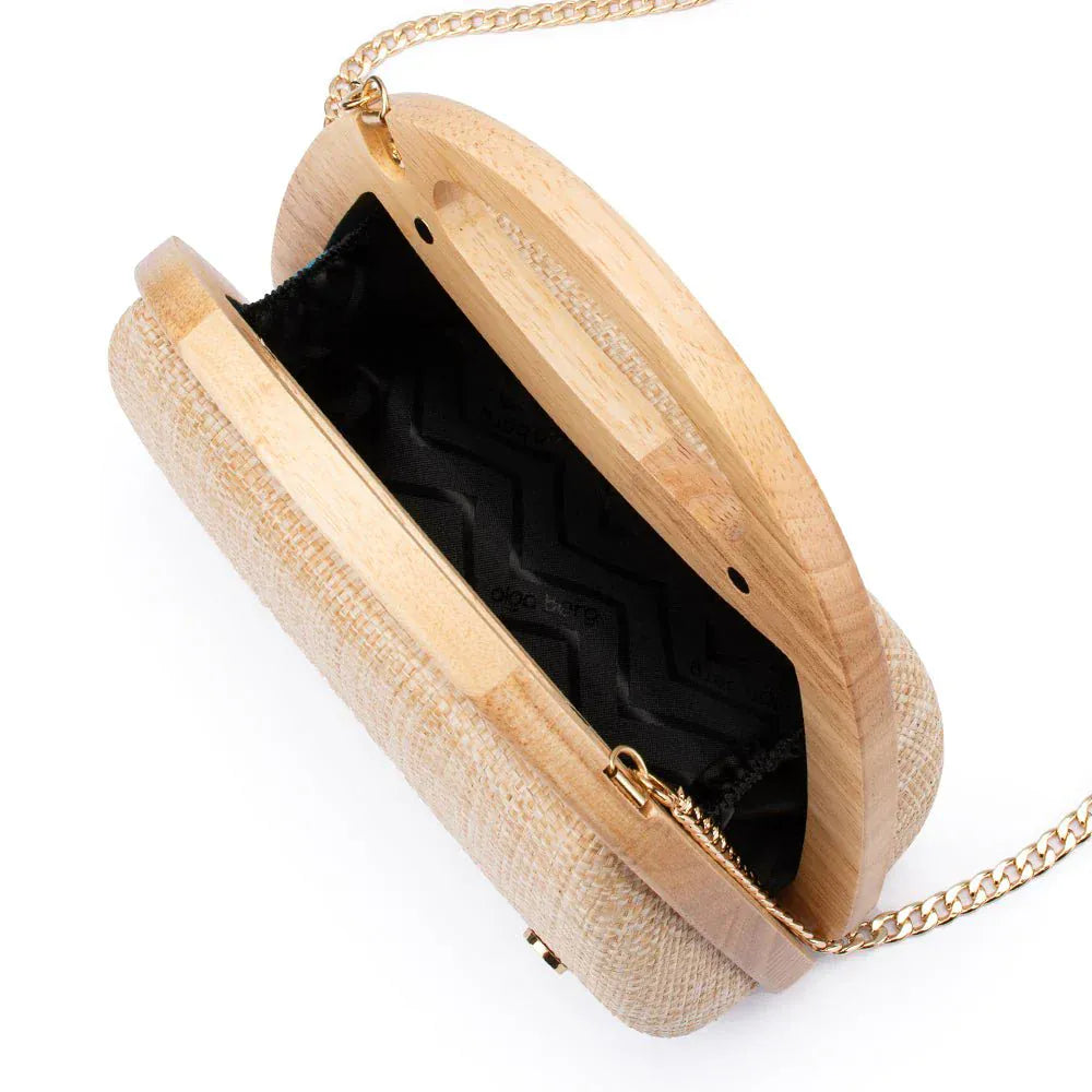 The SARAH Wooden Frame Grab Bag features a stunning woven exterior complemented by a wooden frame. A great option for round the clock events. This bag includes a detachable shoulder chain for when you need to be hands free.