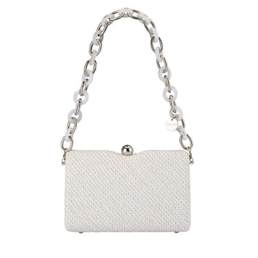 The versatile BIRDIE Textural Handle bag includes a detachable feature acrylic top handle and a long shoulder chain for multiple styling options. This stunning hardcase clutch features a chic woven texture and classic single ball closure to keep your items safe and secure in this roomy bag.