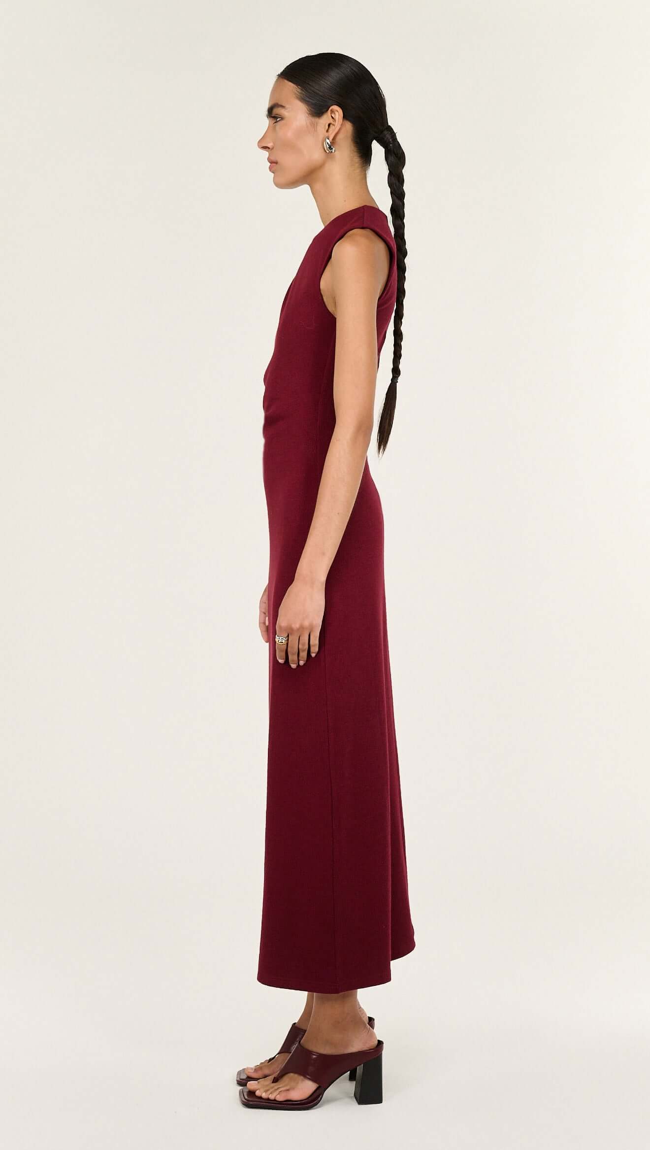 The Althea Red Stretch Jersey Midi Dress is a refined occasion silhouette designed with sculptural draping and subtle hardware accents for modern impact. Crafted from a soft stretch fabrication, it features a sleeveless cut, asymmetric gathered shoulder with ring detail and a softly fitted waist that falls into a streamlined midi-length skirt.