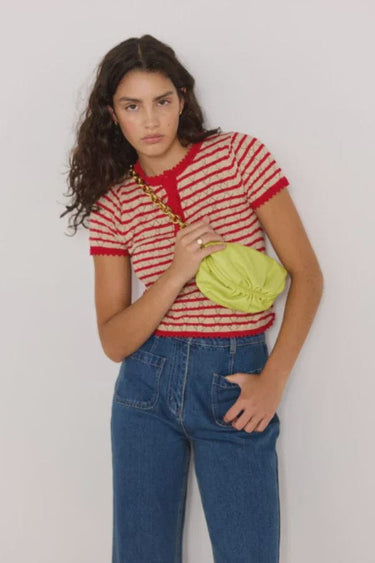 Retro meets playful. This striped knit tee features intricate pointelle texture, contrast trims, and a half-button neckline. A standout on its own or layered under jackets.