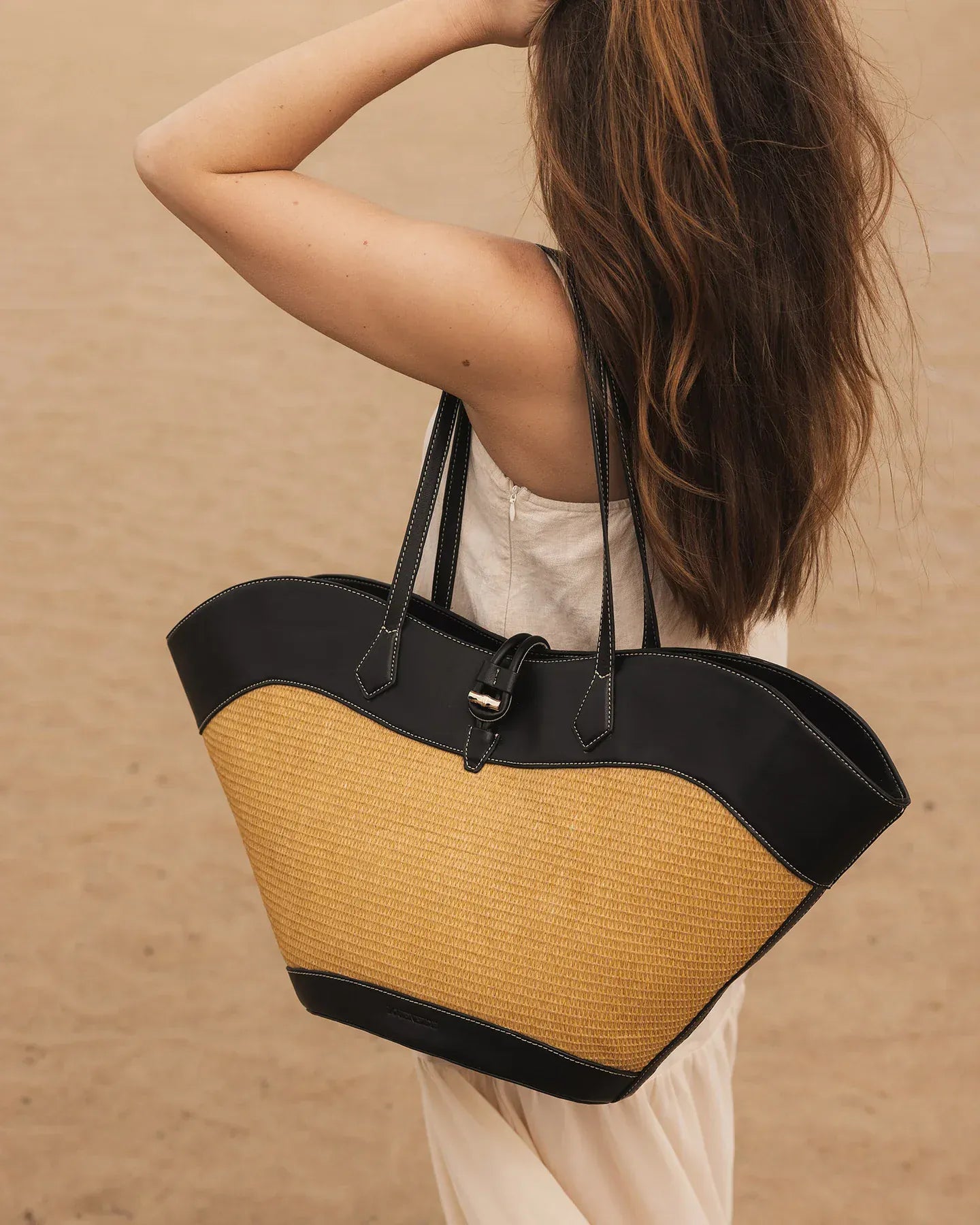 The Malta Raffia Black Tote Bag is a shopper tote bag that blends natural texture with modern structure, designed to elevate your summer wardrobe with ease. Crafted from sun-washed raffia and contrasted with sleek black vegan leather, she adds a sophisticated edge to laid-back coastal styling - making her a standout in the edit of summer bags for women. Defined by her sculptural fan-shaped silhouette, Malta Raffia Black features a narrow base and wide, flared top that creates visual impact while keeping your essentials within easy reach. Offering ample space for everything from daily necessities to beachside extras, she’s thoughtfully finished with two internal pockets for organisation and a buckle strap that loops through a front buckle for a secure yet stylish fastening. With tall dual straps for versatile carry, Malta Raffia Black transitions effortlessly from beachside brunches to sunset dinners.