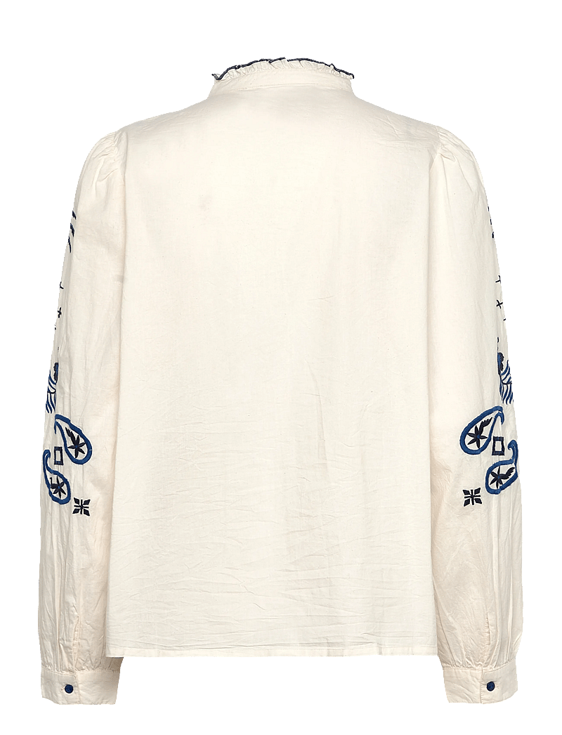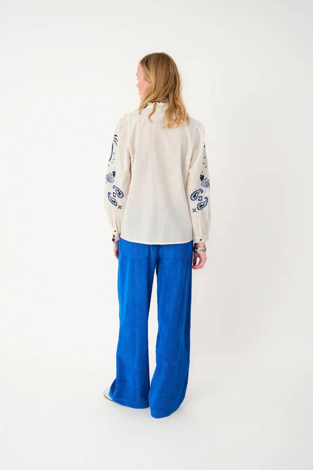 • Exclusive embroidery with palms and graphic elements in blue tones