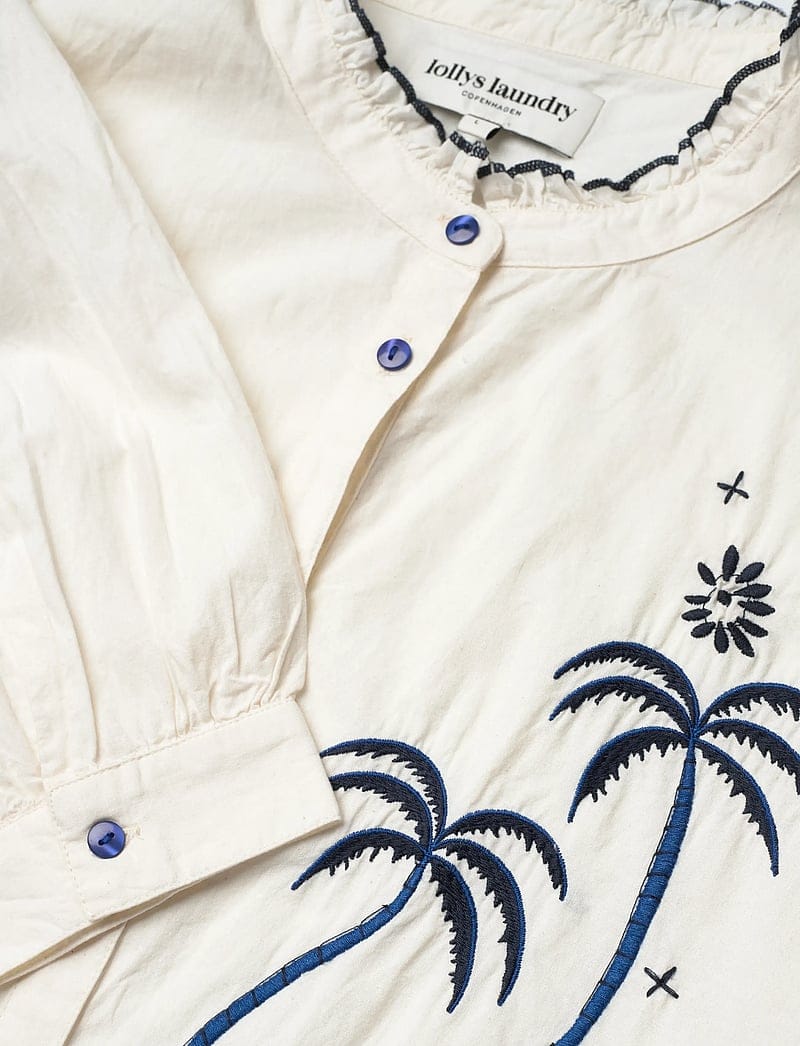 Made from 100% cotton, it's decorated with a stunning palm embroidery in black and blue that stands out beautifully against the white base.