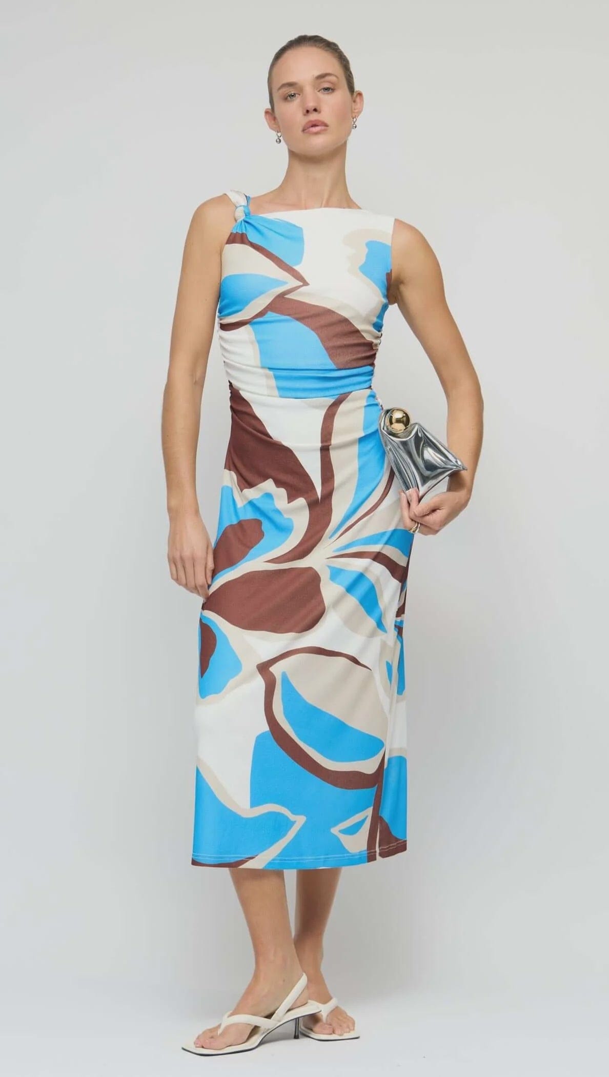 The Cielo Blue Abstract Mesh Midi Dress is your go-to for modern elegance with a bold twist. Crafted from soft stretch mesh, this dress features an asymmetric shoulder with knot detail, gentle ruching through the waist, and a striking abstract print in sky blue, chocolate and ivory tones. The figure-skimming silhouette drapes effortlessly, making it perfect for everything from long lunches to sunset cocktails.