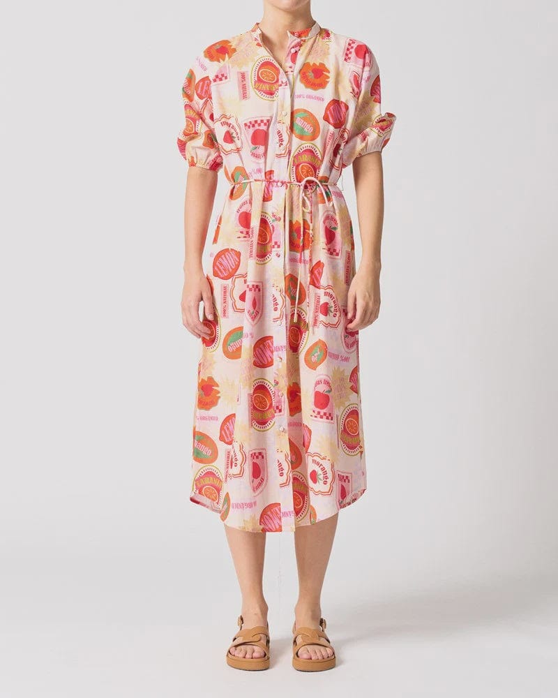The Berlin Dress in our juicy Frutas Frescas print is the perfect throw-on-and-go piece for summer. Crafted from breathable cotton, it features a relaxed midi silhouette with short puff sleeves, a gathered drawstring waist, and an easy button-through front. The vibrant fruit sticker-inspired print brings a splash of nostalgia and fun to every wear—just add sandals and you’re set.