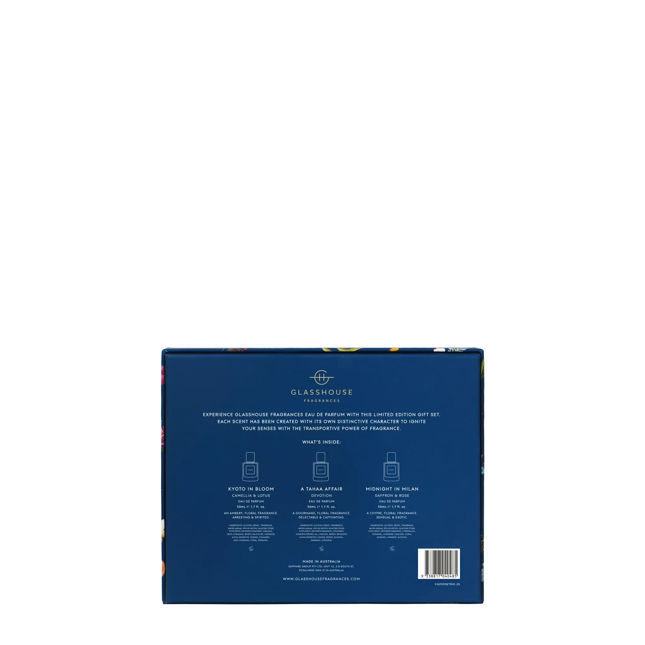 Contains: 1 x Kyoto In Bloom 50mL Eau de Parfum 1 x A Tahaa Affair Devotion 50mL Eau de Parfum & 1 x Midnight In Milan 50mL Eau de Parfum in a gorgeous limited edition gift box. Valued at $300.00.