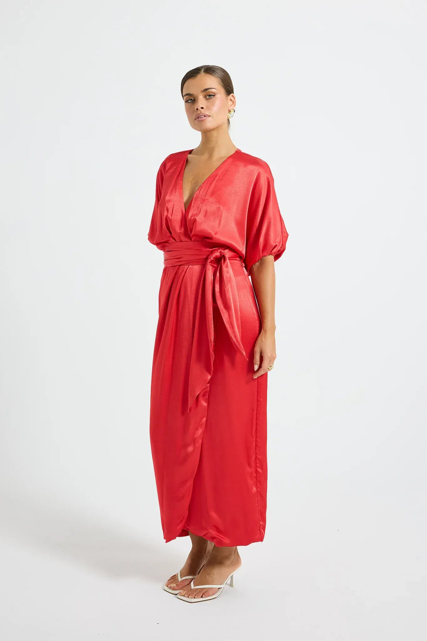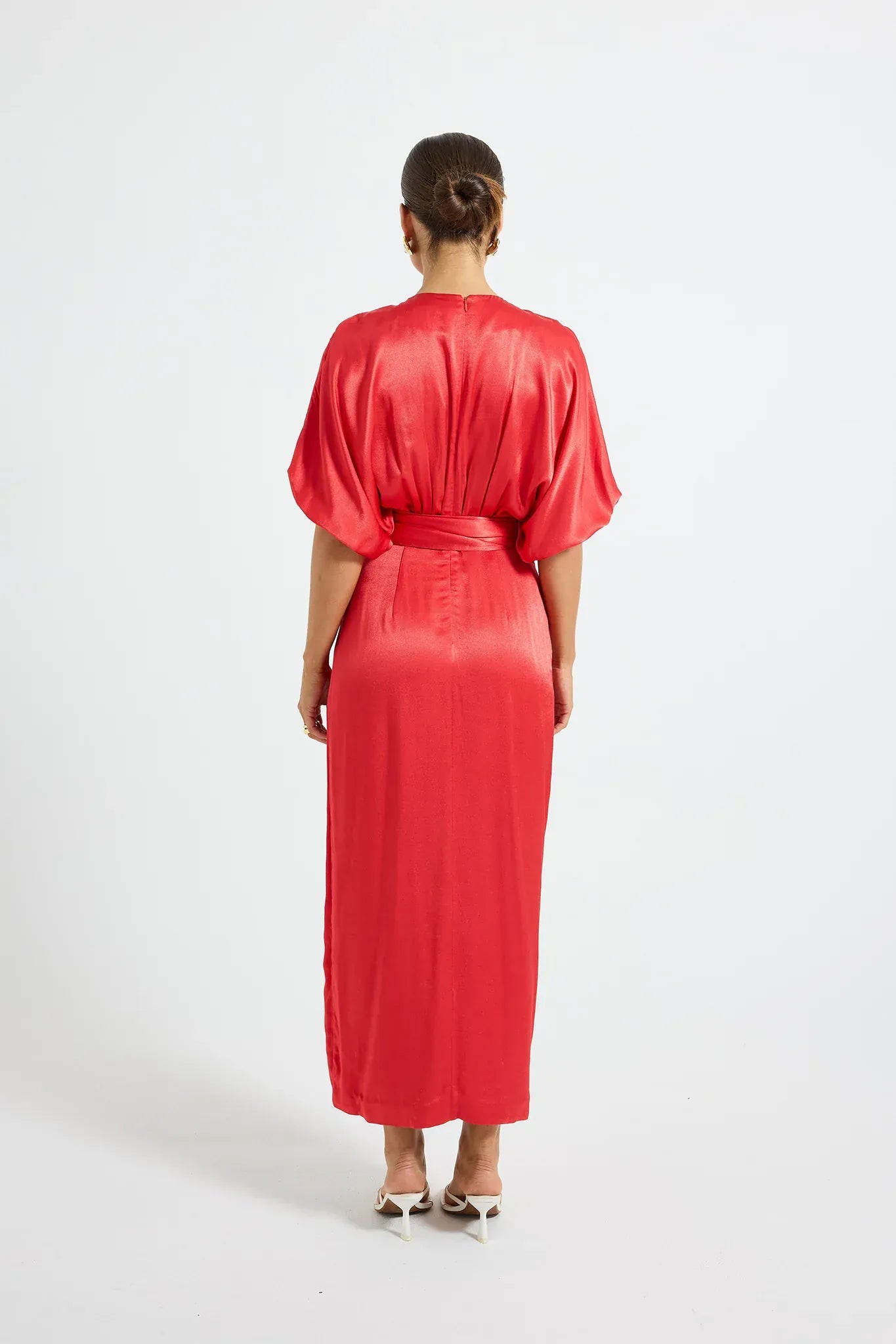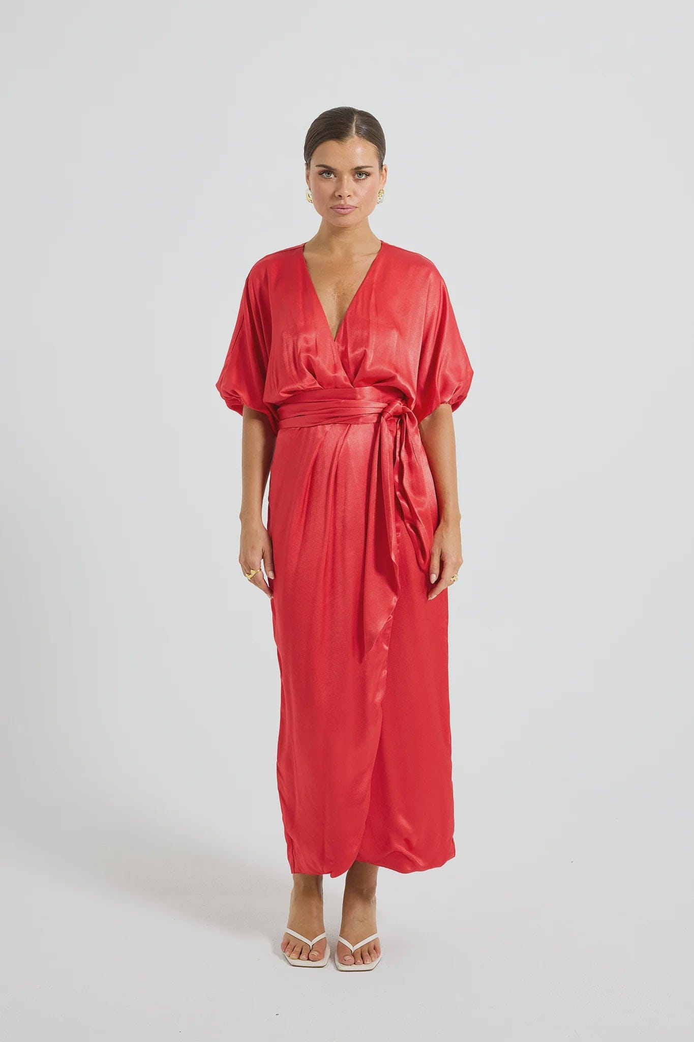 The Quinn Wrap Midi by PASDUCHAS is crafted from lustrous satin. It features a tulip-style mock wrap, secured at the waist with a self-tie to cinch and flatter the figure. The batwing sleeves, finished with elastic at the wrist, balance the blouson bodice. The skirt falls to a traditional midi-length hem, creating a modest yet elegant silhouette. Lined from the waist down for comfort, the piece is finished with an invisible centre-back zipper for ease of fit.
