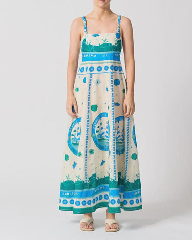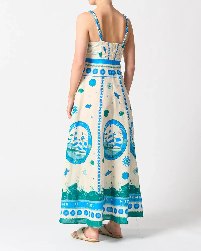 A brand new silhouette for the season, the Sardinia Dress makes a playful statement in our bold Andiamo print. Featuring a square neckline, thick braided straps, and a flattering fitted bodice that flows into a full-length A-line skirt, this style was made for long lunches and coastal strolls. The shirred back panel ensures comfort and flexibility, while the Italian-inspired nautical motifs bring a whimsical, sun-soaked feel to your summer wardrobe.